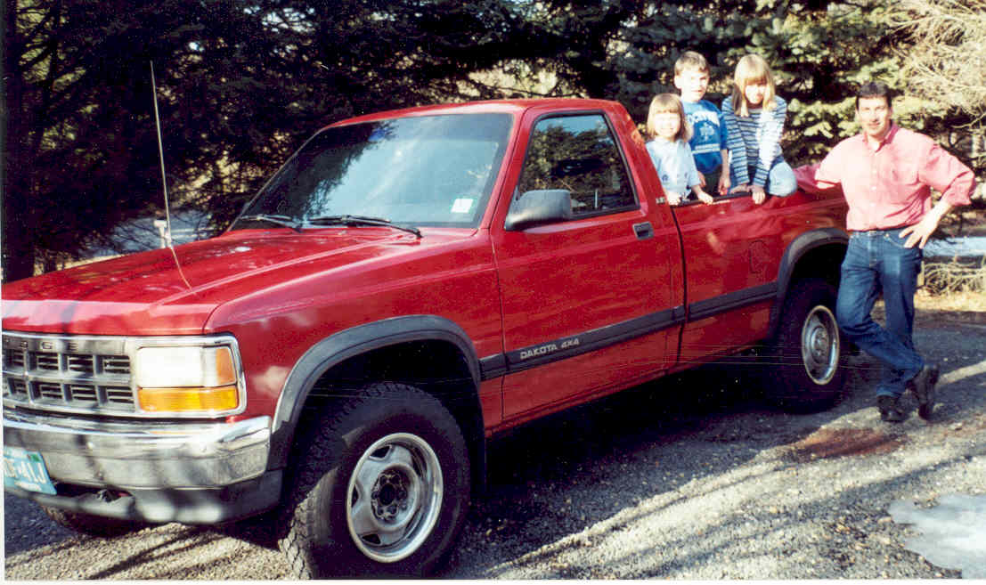 I thought I would post a picture of my 92 Dakota 4x4. I bought it new in November of 91 and still drive it everyday to work. I ordered it with the 3.9 V-6, automatic (originally for my wife but with the traffic jams in NJ it's really nice!) and with the heavy duty electrical/cooling/skid plates options. It has over 141,000 miles on the original drivetrain. It have used it to haul numerous loads of fire wood, home improvement supplies and a rebuilt engine when I had a 68 Plymouth Satellite convertible. In the picture you can see my cargo which consists of Sarah, Joseph and Emma. Sarah made her debut in the April 2002 Power Wagon advertiser when she was 8 months old.