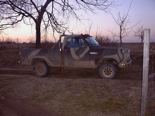 This truck came out of a farmers field. It was buried to its belly. After digging it out and dragging it home I tore her down rebuilt all the running gear. This is still a project truck however I do drive it daily. The camo paint job came from a day of being bored. I still have alot of work to do on this truck. The interior will soon be snow camo. I am having a small wireing problem. When i turn off the key everything goes dim? Any sugg. ? ya'all have fun with your mopars the world tuffest trucks !!!