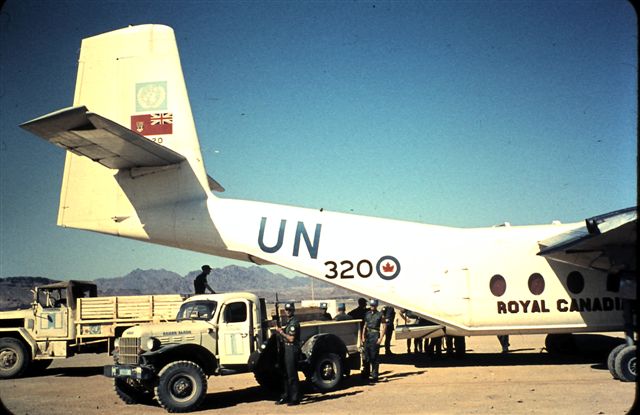 That appears to be an RCAF aircraft, twin engine. Probably a Buffalo. Markings are pre new Canadian flag and before the unification of the armed forces. If I recall correctly, Canada had a UN force in the Suez, so that might help with the timeframe.