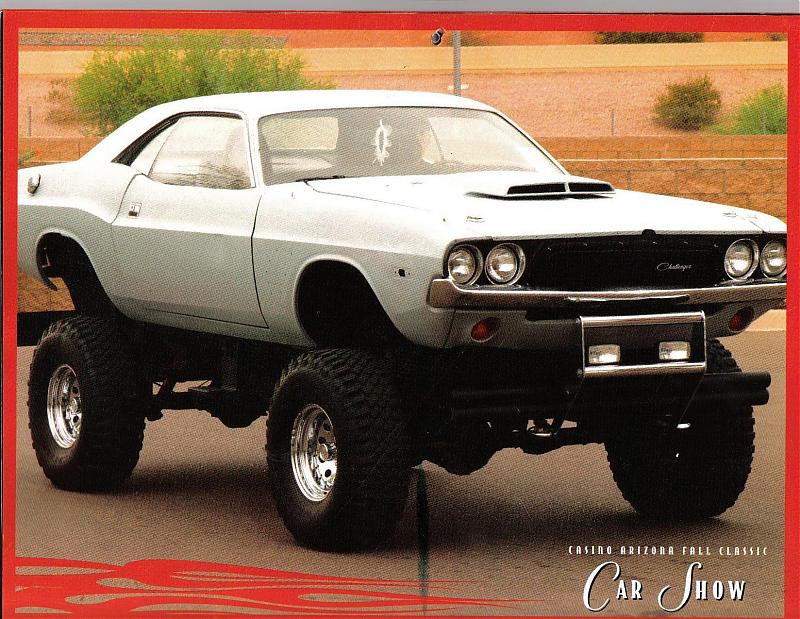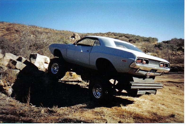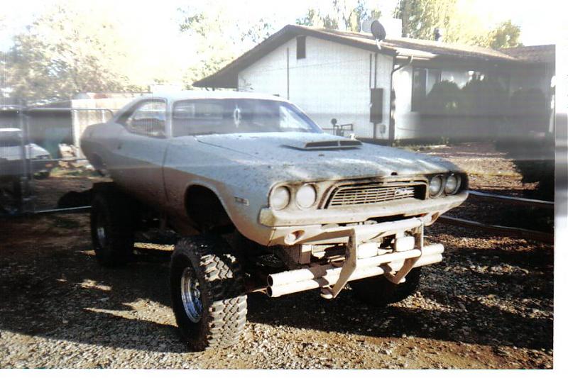 This was my 1974 Challenger that I put on a 1977 Dodge Ramcharger. The Ramcharger had a 440 with a 727 automatic and the 203 transfer case. I put 35/12.50R15 Kumho tires on it It was a frame on frame deal, the subframe on the Challenger was twisted (before I put it on the Ramcharger frame). I couldn't afford to get a new subframe for it. I've always wanted to do something like this since Bigfoot came out when I was a little kid. So it was two in one deal, I had my muscle car which was very comfortable and I had my four wheeler all in one. I made one mean Mopar machine, and it was alot of fun. Thanks for looking.