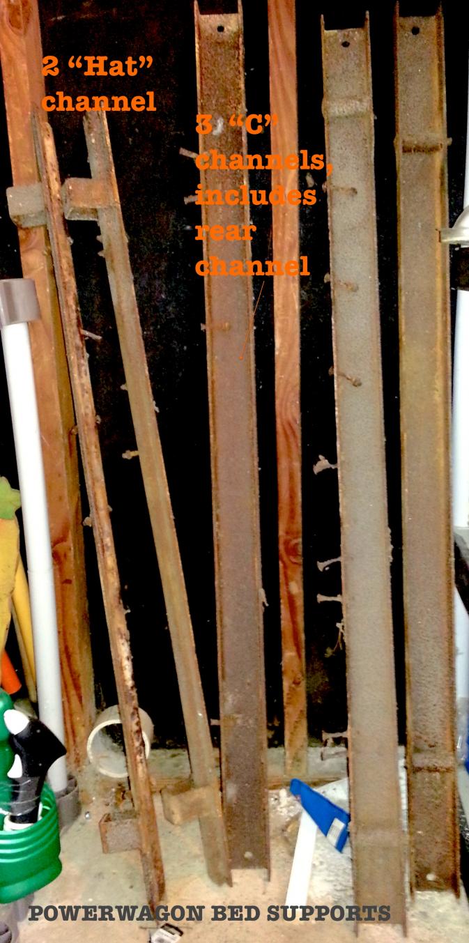Rusty but in good structural condition. The deal includes five pieces: (3) C-Channels: C-Channel #1 (front of bed), C-Channel #2 (mid bed), and Rear C-Channel (at tailgate); also (2) Hat-Channels; Hat Channel #1, and Hat-Channel #2. These are correct for all 1-Ton Dodge Power Wagons 1948-1967 (Flat fender Power Wagons).