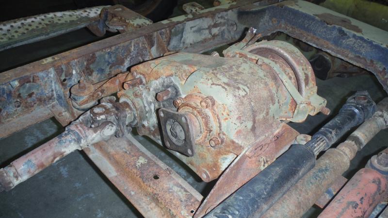 Includes: shock absorbers & brackets, Left side tail light bracket, Complete rear end w/brakes & drums, no rear driveshaft, 4 sets of leaf springs, 4 running board brackets, 1 running board, right side. In poor condition., Transfer case w/emergency brake, Steering box w/steering shaft & steering wheel (in xlnt condition), Steering box connecting rods to wheel, Complete front end w/brake s & drums, includes drive shaft, no tie-rod, Radiator frame upright, Frame spring pads, Right side, lower right engine mud guard