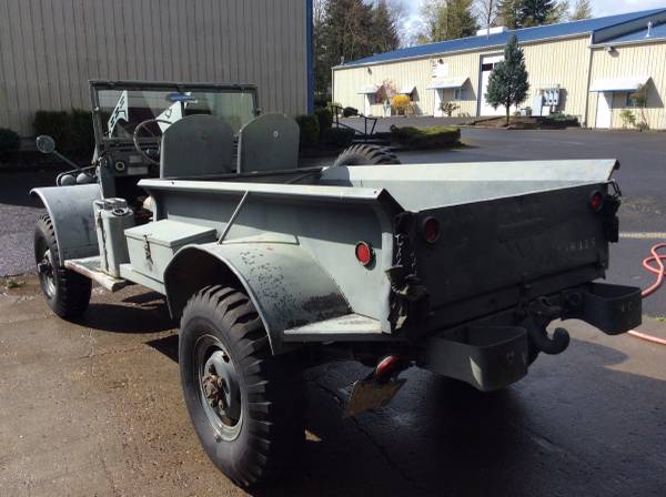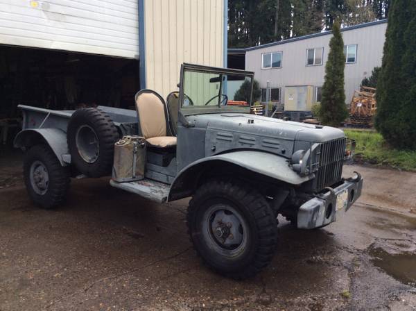 1945 Dodge WC-64KD modified. This truck started out as a “knock-down” ambulance in 1945, only about 25 orig. are known world wide, and very few in the US. This one is in xlnt condition….virtually no rust…other than a little surface patina. It is now powered by a Chevrolet 283ci V8 that just had a recent valve job. The transmission is sychro in every gear. Runs great, starts easily….re-wired to 12 volt system, all the gauges work (except the fuel gauge) and it has a tachometer. Electric fuel pump. The seats are in decent shape. Brakes and steering is fine. All the lights and turn-signals work. It has US Navy markings “USN NCB/6” on the bumpers….Sea Bee’s. An International pickup bed has been fitted to it, and looks very nice. Dualmatic front free-wheeling hubs. Data plate on the glove box, matches the frame number. It comes with an Oregon title (expired tags). PS…I also have lots of M37 and some W series parts and frames available for sale. Price $6950