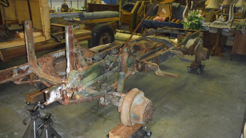 Includes: shock absorbers & brackets, Left side tail light bracket, Complete rear end w/brakes & drums, no rear driveshaft, 4 sets of leaf springs, 4 running board brackets, 1 running board, right side. In poor condition., Transfer case w/emergency brake, Steering box w/steering shaft & steering wheel (in xlnt condition), Steering box connecting rods to wheel, Complete front end w/brake s & drums, includes drive shaft, no tie-rod, Radiator frame upright, Frame spring pads, Right side, lower right engine mud guard